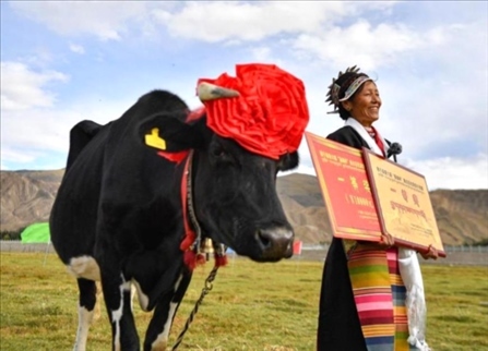 第六屆“聶雄杯”西藏高原·隆子黑白花優(yōu)質(zhì)奶牛競賽在西藏山南市隆子縣進行決賽。按照早晚各一次現(xiàn)場擠奶稱總量計算、體形外貌和系譜檔案三條指標(biāo)進行評比,一頭名叫“扎西”的奶牛奪冠。