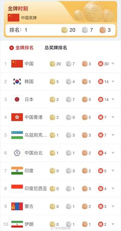 ·杭州亞運會首日中國隊斬獲20金7銀3銅,位列獎牌榜第一名。
