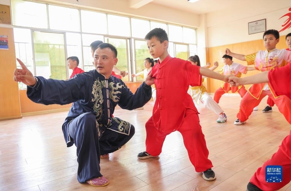 7月8日,在山東省臨沂市蘭山區(qū)一家武術館,武術老師指導學員練習拳法動作。