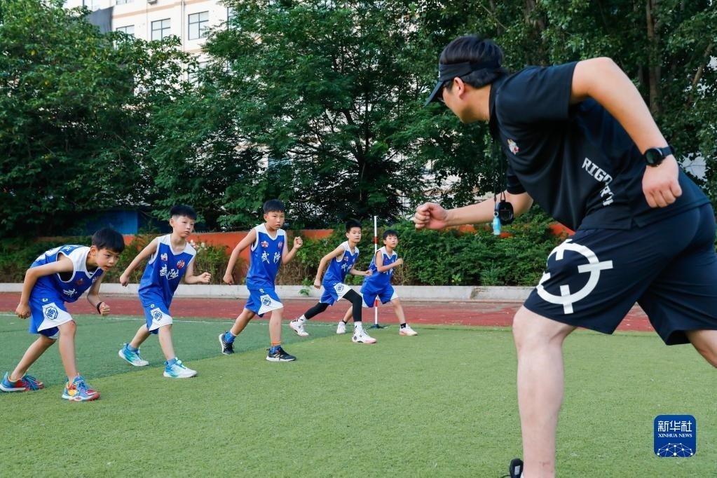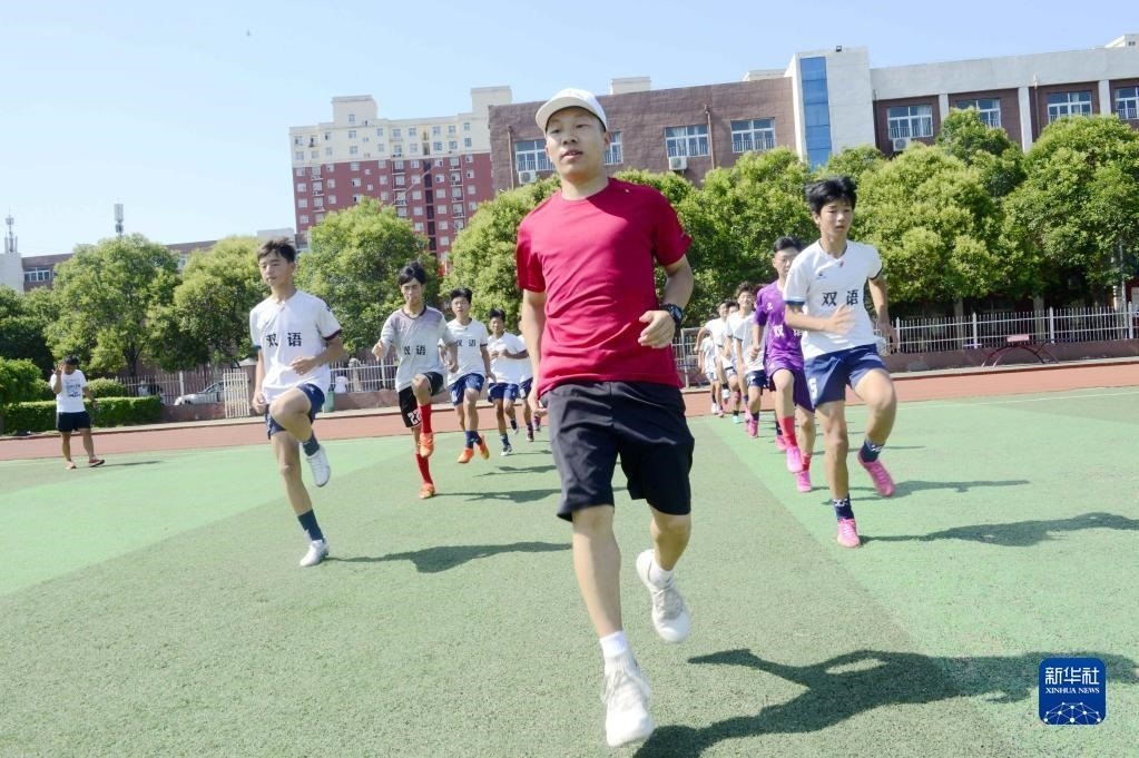 7月7日,在河南省焦作市武陟縣一家體育培訓機構,教練指導學生練習跑步。
