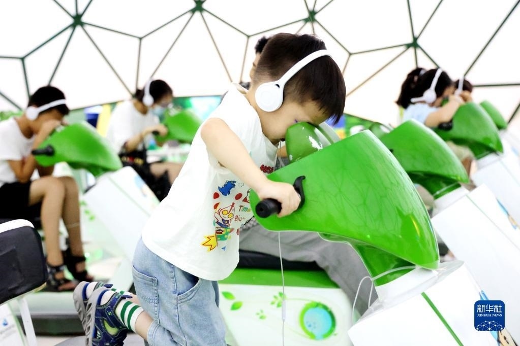 7月8日,兒童在中國杭州低碳科技館參觀體驗。