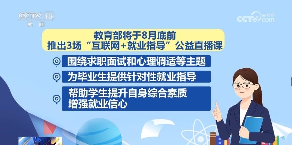 據(jù)了解,教育部將于8月底前推出3場“互聯(lián)網(wǎng)+就業(yè)指導”公益直播課,圍繞求職面試和心理調適等主題,為畢業(yè)生提供針對性就業(yè)指導,幫助學生提升自身綜合素質、增強就業(yè)信心。