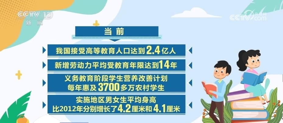當(dāng)前,我國(guó)接受高等教育人口達(dá)到2.4億人,新增勞動(dòng)力平均受教育年限達(dá)到14年。義務(wù)教育階段學(xué)生營(yíng)養(yǎng)改善計(jì)劃每年惠及3700多萬(wàn)農(nóng)村學(xué)生,實(shí)施地區(qū)男女生平均身高比2012年分別增長(zhǎng)了4.2厘米和4.1厘米。