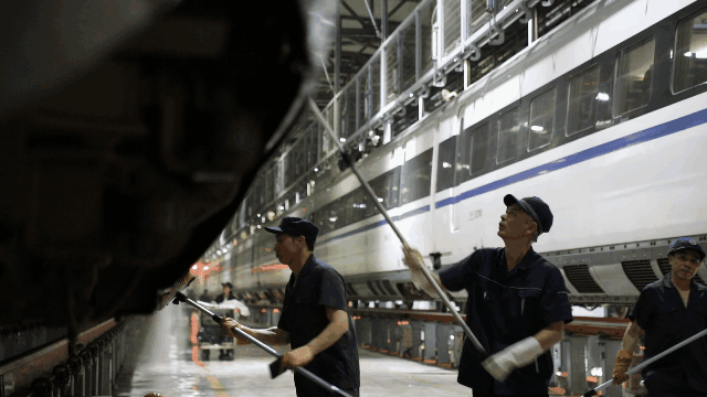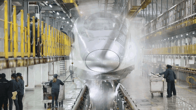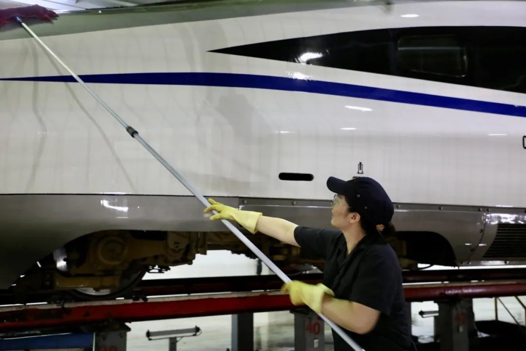 經(jīng)過(guò)自動(dòng)清洗的動(dòng)車組在開(kāi)進(jìn)動(dòng)車所檢修庫(kù)后,將由洗車人員進(jìn)行深度清潔。20多名洗車人員分工協(xié)作對(duì)動(dòng)車組車頂、車身等各部位進(jìn)行清洗。