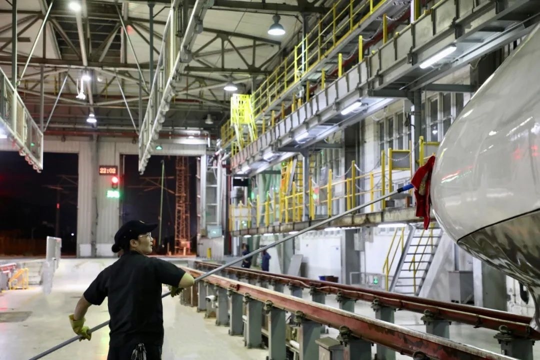 動(dòng)車組經(jīng)過(guò)洗車機(jī)時(shí),調(diào)度室內(nèi)調(diào)度員精準(zhǔn)聯(lián)控司機(jī),機(jī)房有專業(yè)的設(shè)備操作人員負(fù)責(zé)監(jiān)控,確保洗車機(jī)正常運(yùn)轉(zhuǎn),外皮清洗到位。在動(dòng)車檢修庫(kù)內(nèi),質(zhì)檢員全方位卡控人工清洗環(huán)節(jié),檢查清潔是否到位。
