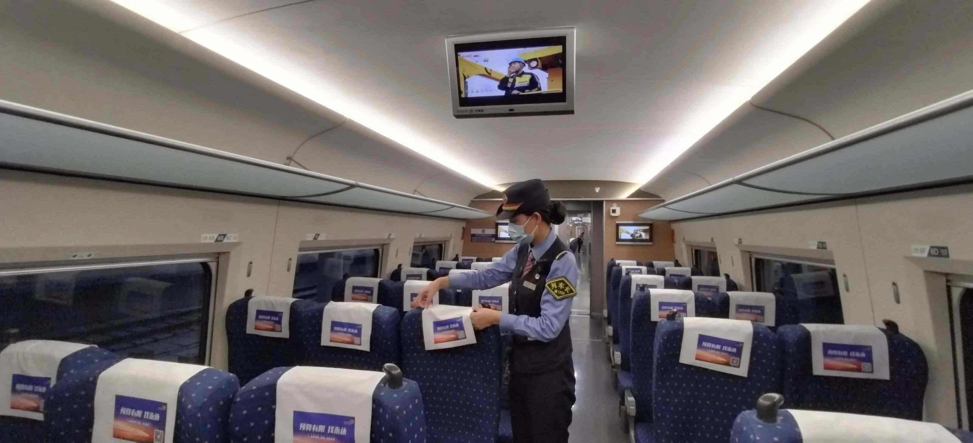 除了車身硬件的“美妝”,在列車上線始發(fā)前,列車乘務(wù)人員還要檢查各類客運(yùn)服務(wù)備品、衛(wèi)生備品等是否準(zhǔn)備齊全。他們需要保證車座椅背后網(wǎng)兜清潔袋擺放整齊,小桌板統(tǒng)一收起,頭枕巾和椅套擺放平整、干凈、無(wú)污染。