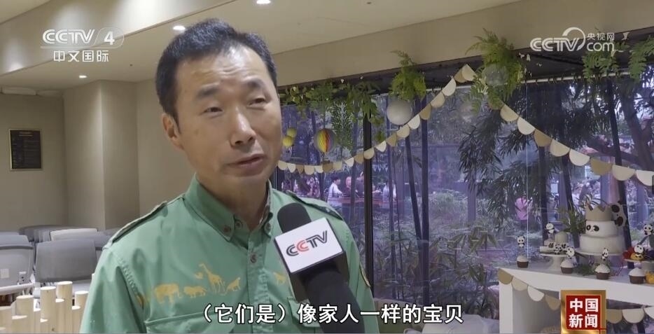 愛(ài)寶樂(lè)園熊貓館飼養(yǎng)員 姜哲遠(yuǎn):我們的“寶”家族真的有家人的感覺(jué),首先愛(ài)寶、樂(lè)寶、福寶的名字都是有含義的,就像它們名字的意思一樣。它們是可愛(ài),又給我?guī)?lái)快樂(lè)的寶物、可愛(ài)的寶物,還有幸福的寶物。對(duì)我來(lái)說(shuō),就像它們的名字一樣,(它們是)像家人一樣的寶貝。