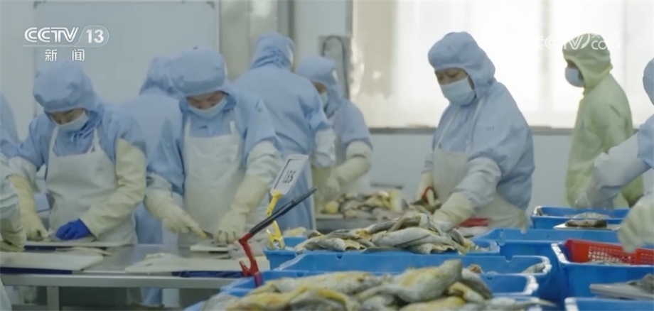 總臺(tái)央視記者 馬寧:我現(xiàn)在來到了寧德市當(dāng)?shù)匾患冶容^大的黃魚生產(chǎn)企業(yè),大家可以看到我身后就是工人們正在把已經(jīng)腌制好的黃魚經(jīng)過分撿、稱重、打包、送進(jìn)冷庫,這些經(jīng)過處理的大黃魚就可以通過冷鏈物流送到千家萬戶的餐桌上。