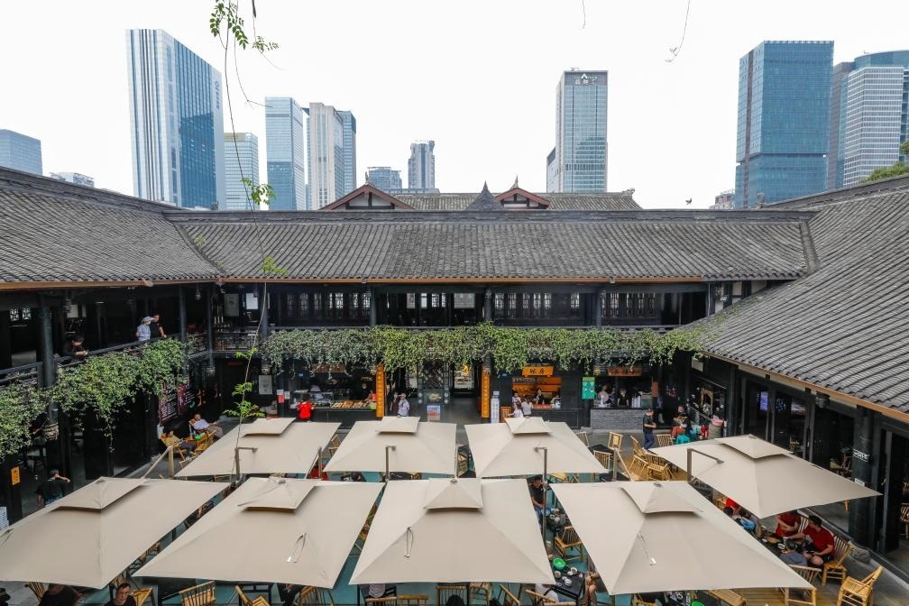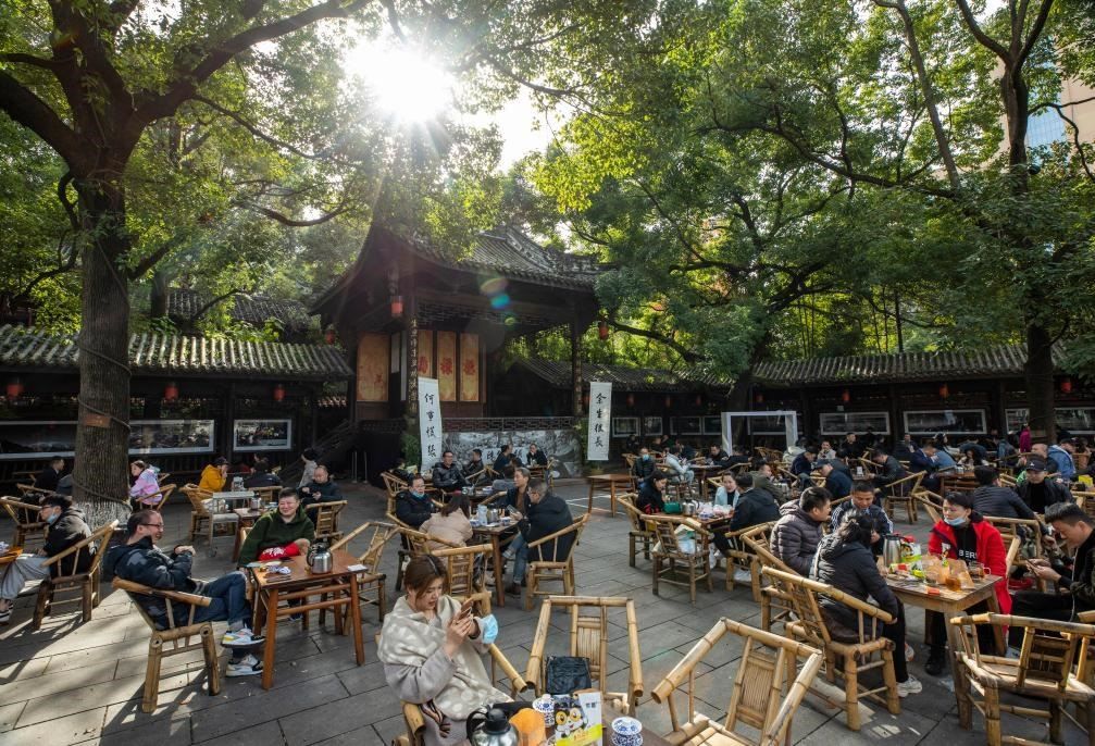 人們在成都太古里大慈寺內(nèi)的茶社喝茶、休閑,不遠處高樓林立