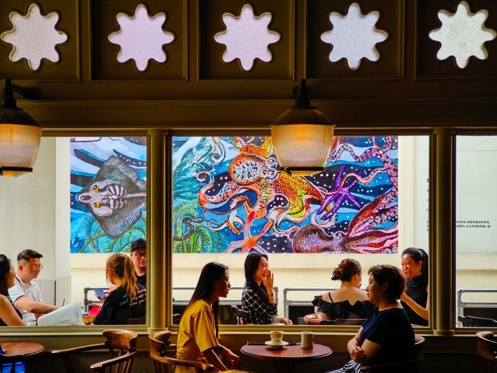 人們在成都大源中央公園的Regular·源野生活空間內(nèi)的咖啡館里休閑