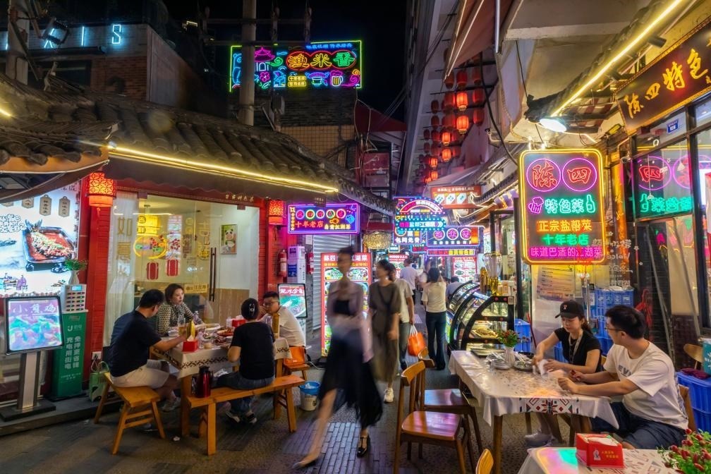 人們在成都猛追灣街道望平社區(qū)的美食一條街“香香巷”里逛街、尋找美食
