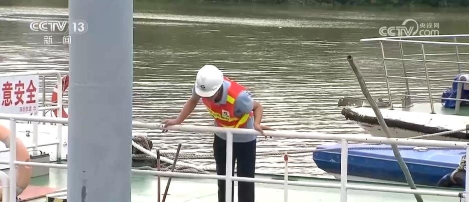 在深圳河皇崗碼頭段,水務(wù)部門的工作人員正在進行臺風前的巡查工作。臺風來臨前,河流船只必須全部回港避險并進行加固處理,沿河的各項工程必須停工。