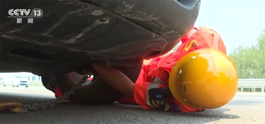 兩人將鐵鏈和拖車(chē)鉤工具套在故障車(chē)前底盤(pán),但這得鉆進(jìn)車(chē)底,貼地操作。中午的高速柏油路面氣溫已經(jīng)逼近60℃,發(fā)燙的路面和陣陣熱浪讓人滿(mǎn)身灼熱感。隨后,兩人通過(guò)卷?yè)P(yáng)機(jī)將故障車(chē)牽引到救援車(chē)上,再逐一固定好故障車(chē)的四個(gè)輪胎。高溫下在高速露天作業(yè),他倆的頭發(fā)上不斷甩出汗珠。