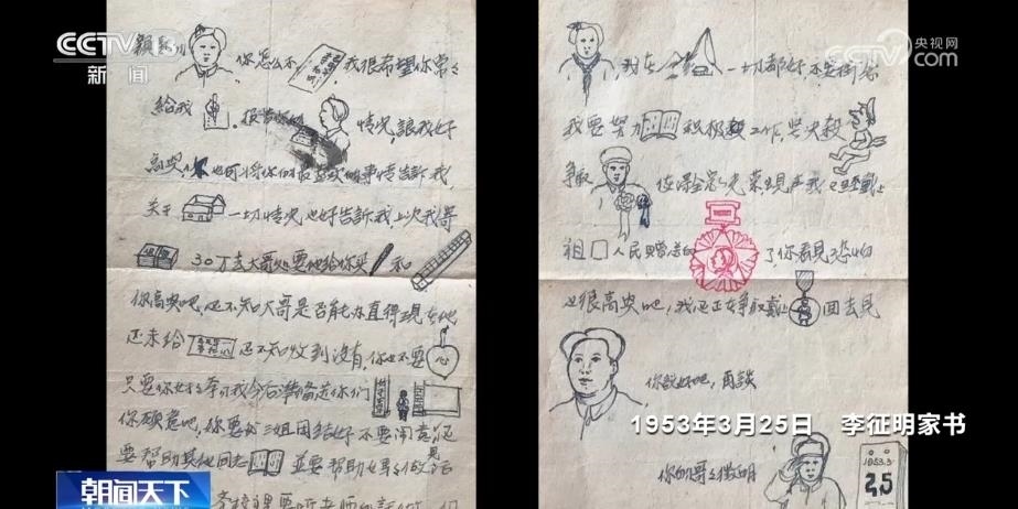 這是一封1953年3月25日從抗美援朝戰(zhàn)場發(fā)往江蘇宿遷的信。在這封戰(zhàn)地家書中,志愿軍戰(zhàn)士李征明為未來的奮斗目標(biāo)做出規(guī)劃。因?yàn)槊妹脗兊哪挲g還很小、識字不多,李征明擔(dān)心她們看不懂,就在信中畫上了許多圖文并茂的小畫。