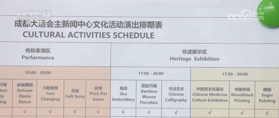 為了讓記者在繁忙的新聞報道之余,勞逸結合、舒緩身心,每天下午5時到晚間,主媒體中心都安排了豐富多彩的非遺文化活動,包括蜀錦蜀繡、川劇變臉、四川竹琴、瓷胎竹編等,讓中外記者感受獨具特色的巴蜀文化。