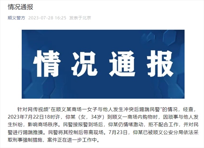 ·網(wǎng)傳“北京順義某商場(chǎng)一女子與他人發(fā)生沖突后踢踹民警”,警方通報(bào)。