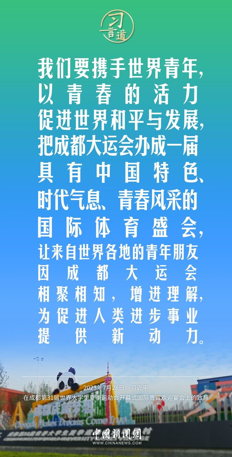 7月28日中午,國家主席習(xí)近平和夫人彭麗媛在四川省成都市金牛賓館舉行宴會,歡迎出席成都第31屆世界大學(xué)生夏季運動會開幕式的國際貴賓。習(xí)近平發(fā)表致辭稱——