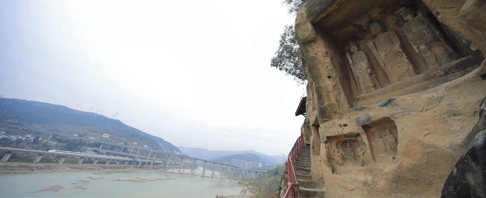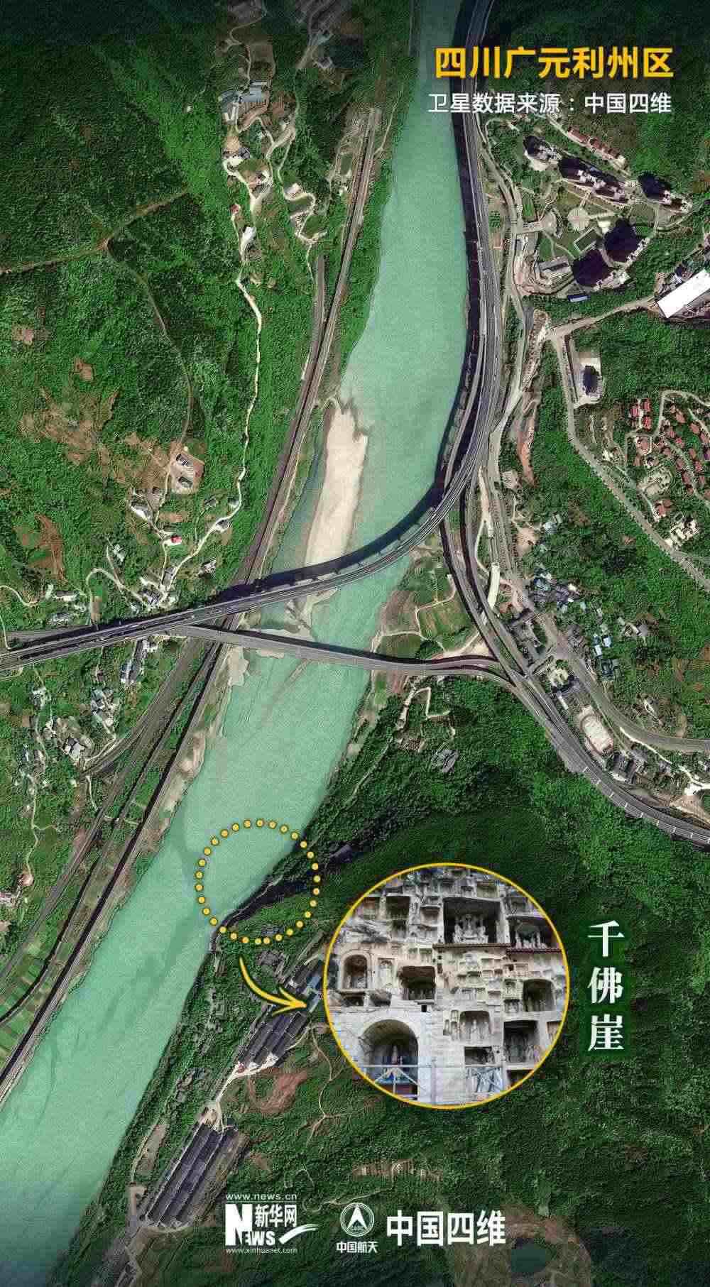 值得關(guān)注的是,就在千佛崖的河對岸,幾條現(xiàn)代化交通網(wǎng)錯落有致地交織在一起。今日的廣元是名副其實(shí)的“交通博物館”。老川陜路、京昆高速、寶成鐵路、西成高鐵、嘉陵江航道在這里交織“奔騰”。橫渡嘉陵江,仿佛穿越古今。