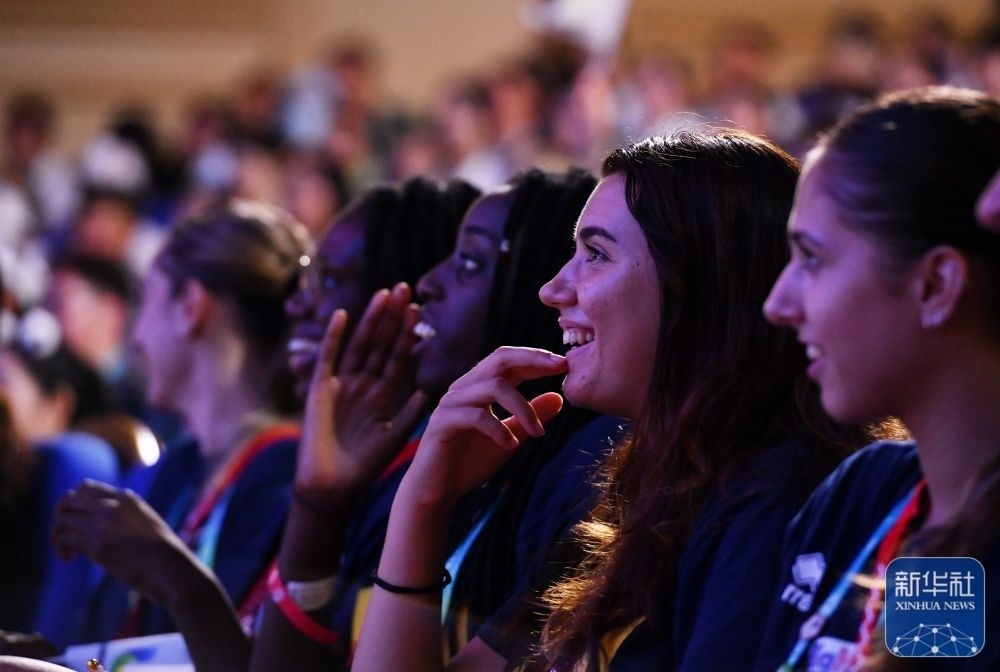 ↑7月29日,外國運動員在聯(lián)歡會現(xiàn)場觀看節(jié)目。新華社記者 張端 攝