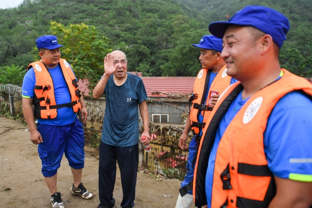 8月1日,在北京市門(mén)頭溝區(qū)水峪嘴村,一名87歲的村民向助他脫困的河北秦皇島獵豹救援隊(duì)隊(duì)員表示感謝。新華社記者 鞠煥宗 攝