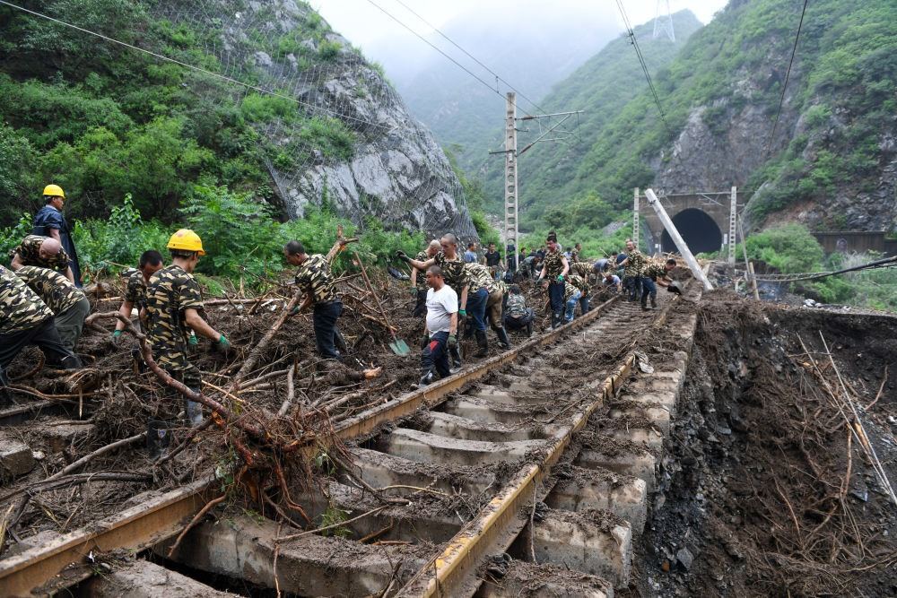 8月1日,在北京市門(mén)頭溝區(qū)水峪嘴村附近一段被阻斷的鐵路線上,中鐵六局的工作人員在清理軌道上的雜物,全力恢復(fù)交通。新華社記者 鞠煥宗 攝
