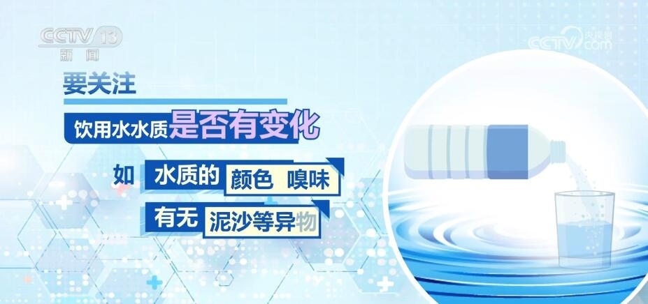 要關(guān)注飲用水水質(zhì)是否有變化,如水質(zhì)的顏色、嗅味,有無(wú)泥沙等異物,如有異常,切勿飲用。