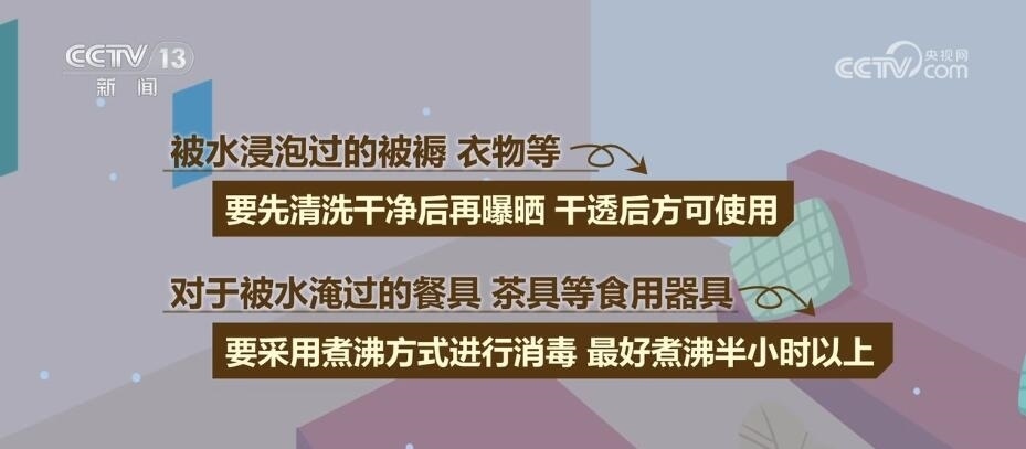 被水淹過(guò)的房屋和環(huán)境中會(huì)有多種細(xì)菌、病毒殘留,入住前應(yīng)進(jìn)行消毒,打掃房屋,開(kāi)窗通風(fēng);對(duì)墻面、桌面、地面使用消毒劑消毒;被水浸泡過(guò)的被褥、衣物等,要先清洗干凈后再曝曬,干透后方可使用;對(duì)于被水淹過(guò)的餐具、茶具等食用器具,要采用煮沸方式進(jìn)行消毒,最好煮沸半小時(shí)以上。