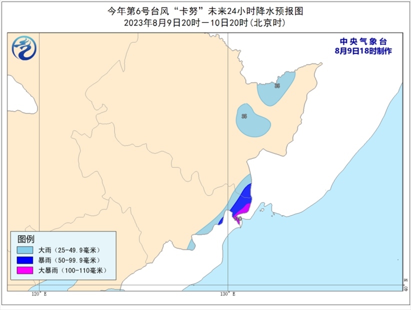 9日20時(shí)至10日20時(shí),吉林東北部、黑龍江東部將有大到暴雨,局部有大暴雨(100-110毫米)。