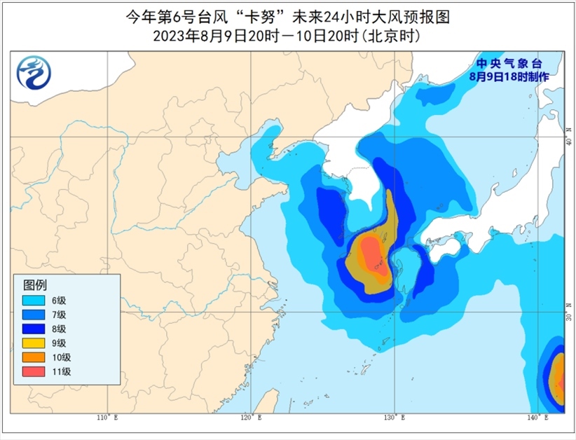 央視網(wǎng)消息:據(jù)中央氣象臺網(wǎng)站消息,中央氣象臺8月9日18時(shí)繼續(xù)發(fā)布臺風(fēng)藍(lán)色預(yù)警。今年第6號臺風(fēng)“卡努”(KHANUN)(強(qiáng)熱帶風(fēng)暴級)的中心今天(9日)下午5點(diǎn)鐘位于日本九州鹿兒島偏西方向大約180公里的東海北部海面上,就是北緯31.9度、東經(jīng)128.7度,中心附近最大風(fēng)力有11級(30米/秒),中心最低氣壓為980百帕,七級風(fēng)圈半徑320公里,十級風(fēng)圈半徑120-160公里。