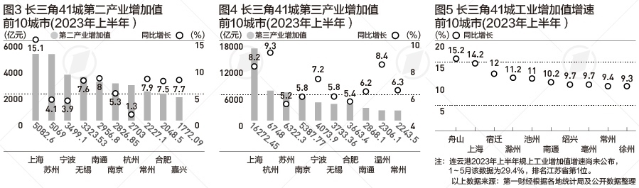 第一財(cái)經(jīng)記者梳理公開數(shù)據(jù)發(fā)現(xiàn),長(zhǎng)三角41城中,共有8個(gè)城市的上半年GDP超5000億元,6市增速達(dá)到或超過8%。