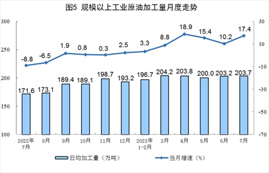 原油加工增速加快。7月份,加工原油6313萬噸,同比增長17.4%,增速比6月份加快7.2個百分點,日均加工原油203.7萬噸。1—7月份,加工原油42671萬噸,同比增長10.9%。