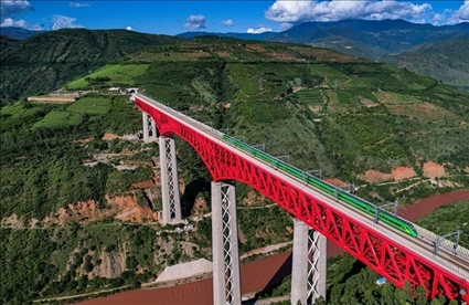△中老鐵路國(guó)際旅客列車(chē)行駛在云南元江特大橋上。