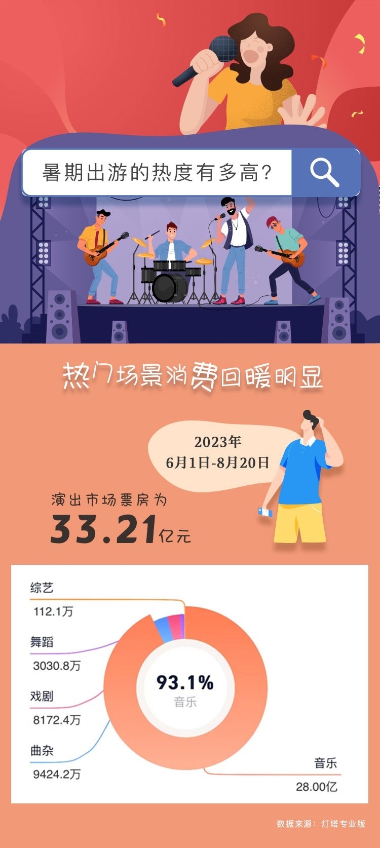作為演出市場(chǎng)的傳統(tǒng)旺季,暑假期間演唱會(huì)、Live house、戲劇、音樂(lè)劇等各類(lèi)熱門(mén)演出“一票難求”。根據(jù)燈塔專(zhuān)業(yè)版最新數(shù)據(jù),暑期檔中的6月1日至8月23日演出市場(chǎng)票房已經(jīng)超過(guò)30億元,而相當(dāng)可觀的跨城觀演比例,更引得除了演出票房之外的周邊產(chǎn)業(yè)一起火。“一個(gè)演出圈粉一座城”,當(dāng)?shù)芈糜谓?jīng)濟(jì)不斷涌現(xiàn)新的可能。