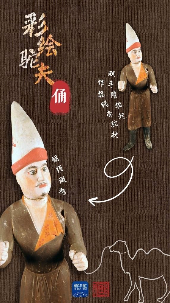 吐魯番阿斯塔那206號墓是唐代高昌左衛(wèi)大將軍張雄與妻子的合葬墓。墓中出土的木俑做工精湛,大多是由中原生產(chǎn),具有明顯的盛唐風(fēng)格,彩繪駝夫俑便出土于此。駝夫?yàn)楹四凶有蜗螅钅扛弑?,胡須微翹,頭戴高聳折沿白氈尖帽,身著褐色掩襟長袍,足穿高棱黑靴。此俑為分段雕刻膠合而成,再施以彩繪,面部表情富有神韻,惟妙惟肖。通過駝夫生動的神情仿佛看到他牽著駱駝,帶著各色商品,沿著絲綢之路慢慢走來。