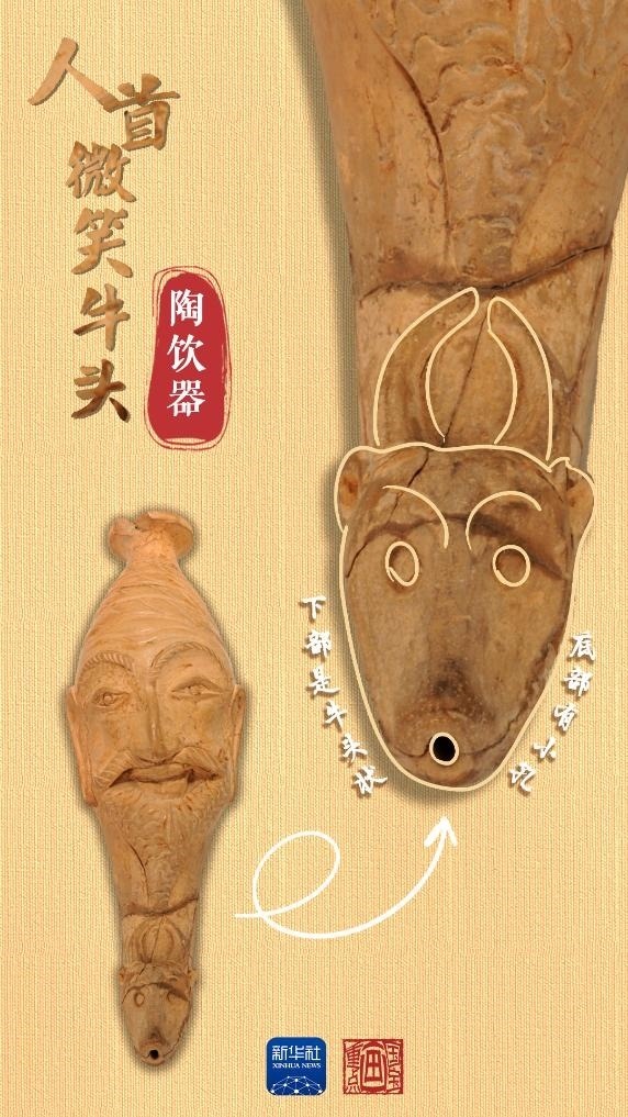 當(dāng)中國絲綢的美譽(yù)經(jīng)由古絲綢之路在西亞、歐洲等地傳揚(yáng)時,西方文明也穿過風(fēng)沙與長歌,在中國留下了印記。人首微笑牛頭陶飲器出土于和田地區(qū)約特干遺址,為唐代時期文物。飲器上部為人首形,下部是牛頭狀,底部帶小圓孔,上下兩部分內(nèi)腔相通。人首上唇胡須外展卷翹,面帶微笑。牛頭微微上翹,牛角豎立攏圓。這種飲器造型源自“來通”,即末端為動物形或人首形的角杯,是小亞細(xì)亞和地中海地區(qū)常見的飲酒器具,絲綢之路沿線國家都有類似文物出土。