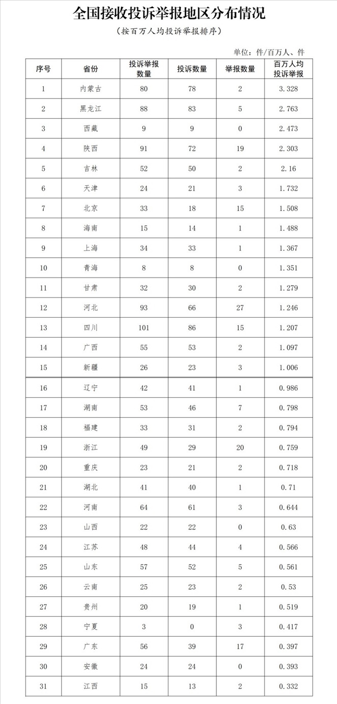 各?。ㄗ灾螀^(qū)、直轄市)按照接收投訴舉報(bào)數(shù)量排序,四川、河北、陜西、黑龍江、內(nèi)蒙古排在全國前5位。其中:按投訴數(shù)量排序,四川、黑龍江、內(nèi)蒙古、陜西、河北排在全國前5位;按舉報(bào)數(shù)量排序,河北、浙江、陜西、廣東、北京(四川并列)排在全國前5位;按百萬人均投訴舉報(bào)數(shù)量排序,內(nèi)蒙古、黑龍江、西藏、陜西、吉林排在全國前5位。(全國接收投訴舉報(bào)地區(qū)分布情況詳見附件1)