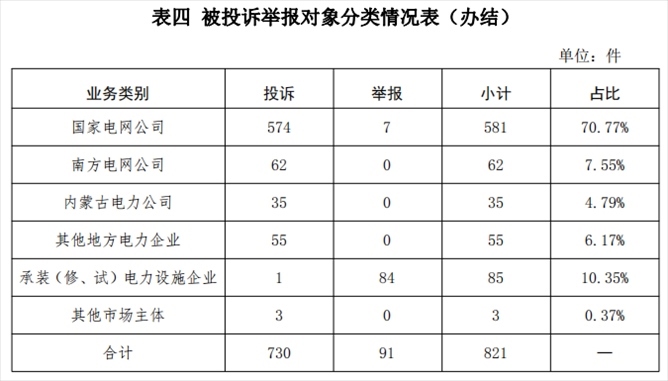 從被投訴舉報(bào)對象看,供電企業(yè)733件、占投訴舉報(bào)總數(shù)的89.28%,其中國家電網(wǎng)公司581件、占比70.77%,南方電網(wǎng)公司62件、占比7.55%,內(nèi)蒙古電力公司35件、占比3.65%,其他地方電力企業(yè)55件、占比6.17%;承裝(修、試)電力設(shè)施企業(yè)85件、占比10.35%;其他市場主體3件、占比0.37%。