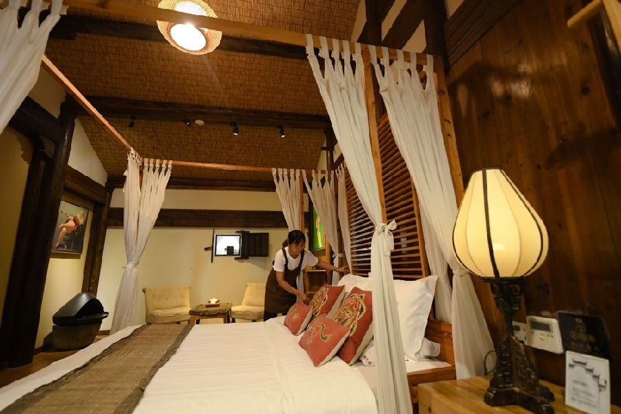 諸葛村一家民宿的工作人員在整理房間(2023年8月1日攝)。新華社記者 翁忻旸 攝