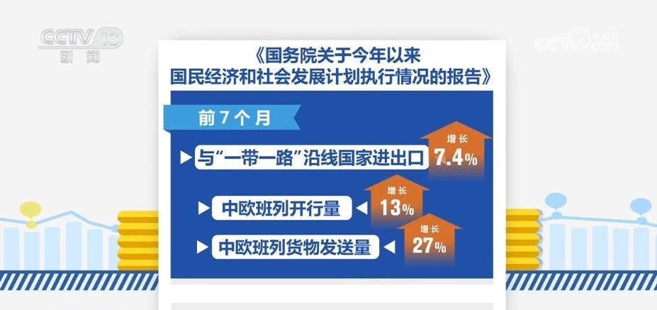 報(bào)告顯示,共建“一帶一路”持續(xù)推進(jìn)。鞏固拓展與重點(diǎn)共建國家和國際組織的務(wù)實(shí)合作,進(jìn)一步強(qiáng)化風(fēng)險(xiǎn)防控,前7個(gè)月與“一帶一路”沿線國家進(jìn)出口增長(zhǎng)7.4%,中歐班列開行量、貨物發(fā)送量分別增長(zhǎng)13%、27%。