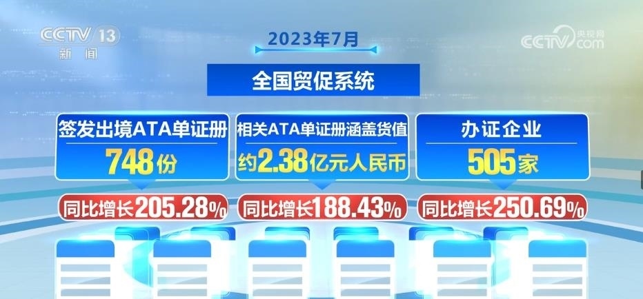 2023年7月,全國(guó)貿(mào)促系統(tǒng)共簽發(fā)出境ATA單證冊(cè)748份,同比增長(zhǎng)205.28%;相關(guān)ATA單證冊(cè)涵蓋貨值約2.38億元人民幣,同比增長(zhǎng)188.43%;辦證企業(yè)505家,同比增長(zhǎng)250.69%。