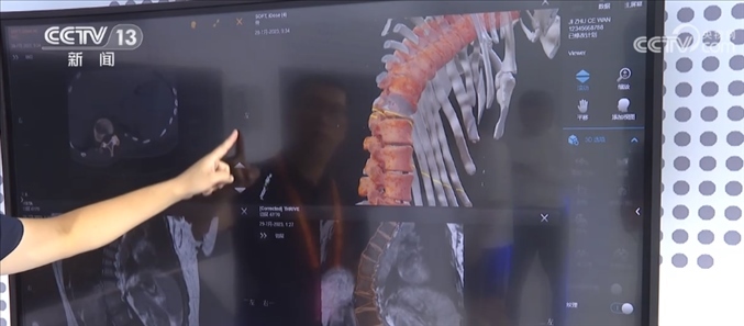 總臺記者 王豐:這里主要呈現(xiàn)的是一個智能手術(shù)室的系統(tǒng),這是一套幫助醫(yī)生進(jìn)行精準(zhǔn)手術(shù)計(jì)劃的設(shè)備,比如說我們可以利用一張X光片,一張CT或者一張核磁影像,就可以還原出一個3D的影像,醫(yī)生通過3D的建模,可以精準(zhǔn)地看到病灶所在的位置,包括他如何下刀,來精準(zhǔn)地制定手術(shù)計(jì)劃。