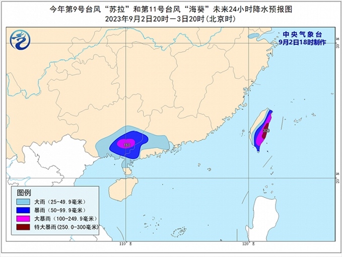 降水預報: 9月2日20時至3日20時,受“蘇拉”和“??庇绊懀瑥V西中南部、廣東西南部、臺灣島大部有大到暴雨,其中,廣西東南部、臺灣島東部等地部分地區(qū)有大暴雨,臺灣島東部局地有特大暴雨(250-300毫米)。