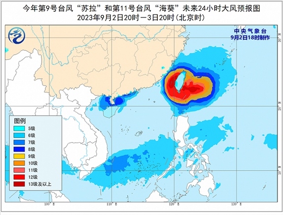 大風預報:9月2日20時至3日20時,受“蘇拉”影響,廣東中西部沿海、廣西南部沿海、海南島北部沿海、珠江口及澳門等地將有6-7級大風,南海西北部、北部灣東部和瓊州海峽將有8級、陣風9-10級的大風;受“??庇绊?,巴士海峽南部、臺灣海峽西部、東海南部及釣魚島附近海域、浙江南部沿海、福建中北部沿海、臺灣島沿海將有6-8級、陣風9-10級大風,巴士海峽北部、臺灣海峽東部、臺灣以東洋面及臺灣島南部沿海的風力有9-12級,陣風13-14級,“??敝行慕涍^的附近海面或地區(qū)的風力有13-16級,陣風17級。