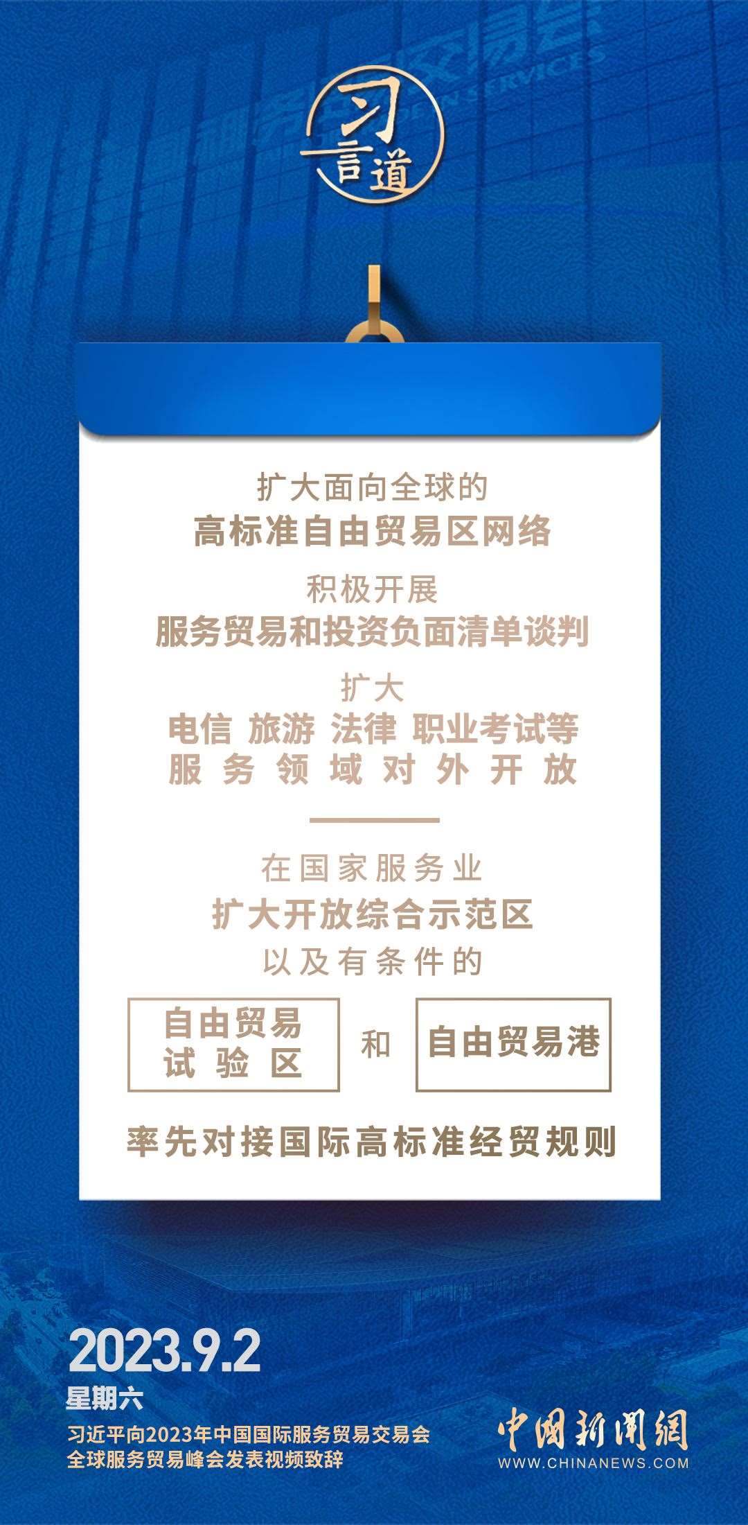9月2日上午,國家主席習近平在北京向2023年中國國際服務(wù)貿(mào)易交易會全球服務(wù)貿(mào)易峰會發(fā)表視頻致辭。習近平指出——