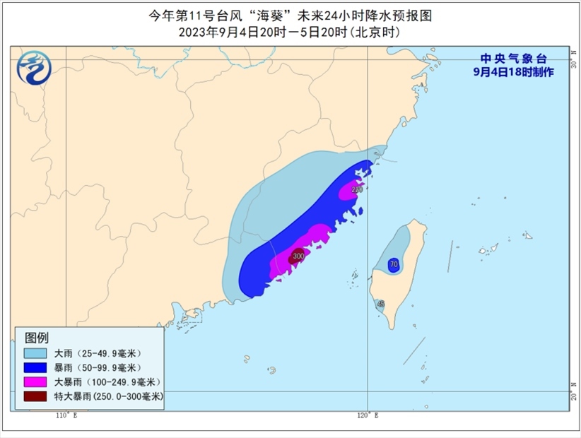 降水預(yù)報(bào):9月4日20時(shí)至5日20時(shí),福建大部、廣東東部、江西東南部、浙江東南部、臺(tái)灣島西部等地部分地區(qū)有大到暴雨,其中,福建東部、廣東東南部等地部分地區(qū)有大暴雨,局地特大暴雨(250-300毫米)。上述部分地區(qū)伴有短時(shí)強(qiáng)降水(最大小時(shí)降雨量30-50毫米,局地可超過70毫米),局地有雷暴大風(fēng)等強(qiáng)對(duì)流天氣。