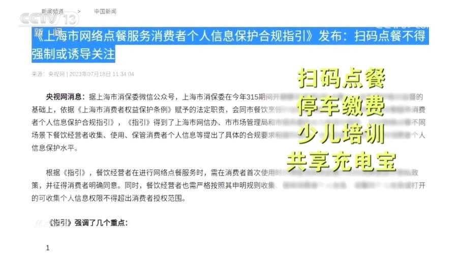 為了加強(qiáng)個(gè)人信息保護(hù),上海市消保委自7月起針對(duì)掃碼點(diǎn)餐、停車?yán)U費(fèi)、少兒培訓(xùn)和共享充電寶等四種消費(fèi)場(chǎng)景,分別出臺(tái)了合規(guī)指引、自律承諾和合規(guī)清單。未來(lái),還將針對(duì)房產(chǎn)中介、商超購(gòu)物等主要消費(fèi)場(chǎng)景作出相應(yīng)指引。
