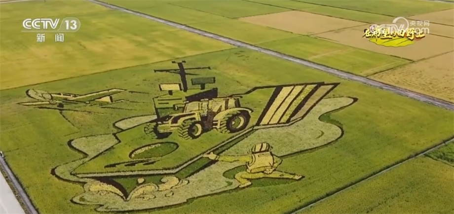總臺央視記者 蔣樹林:金秋9月的稻田是什么顏色的?9月的稻香又是什么味道?來這里,有可能會找到您想要的答案。我現(xiàn)在是在黑龍江北大荒閆家崗農場。大家來看,這個稻田觀景臺有十多米高,因此站在這里,秋日稻田大片的圖案映入眼簾,今年稻田畫以“鄉(xiāng)村振興”“數(shù)字農業(yè)”為主題,生動展現(xiàn)了“讓農業(yè)更美好、讓農民更幸福”的美好愿景。稻田畫是農民們勤勞與智慧的展現(xiàn),他們用稻田畫為家鄉(xiāng)水稻代言,而對于在黑土地打拼的北大荒人而言,還有更重要的意義。