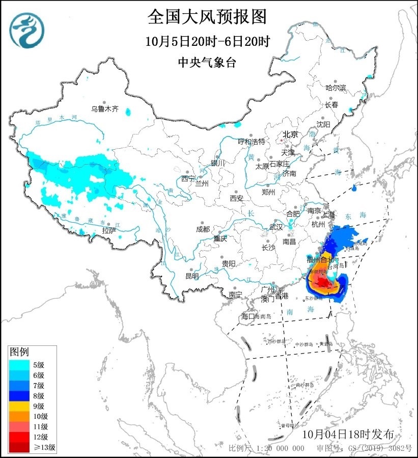 10月5日20時(shí)至6日20時(shí),東海西南部海域、臺(tái)灣海峽、臺(tái)灣以東洋面偏南海域、巴士海峽偏北海域、南海東北部偏北海域?qū)⒂?~8級(jí)、陣風(fēng)9~10級(jí)的大風(fēng),其中臺(tái)灣海峽、南海東北部的部分海域風(fēng)力可達(dá)9~10級(jí)、陣風(fēng)11~12級(jí),臺(tái)風(fēng)“小犬”中心經(jīng)過(guò)的附近海域風(fēng)力可達(dá)11~12級(jí)、陣風(fēng)13級(jí);西藏西部、浙江沿海、福建沿海、臺(tái)灣島將有5~6級(jí)、陣風(fēng)7級(jí)的大風(fēng)。