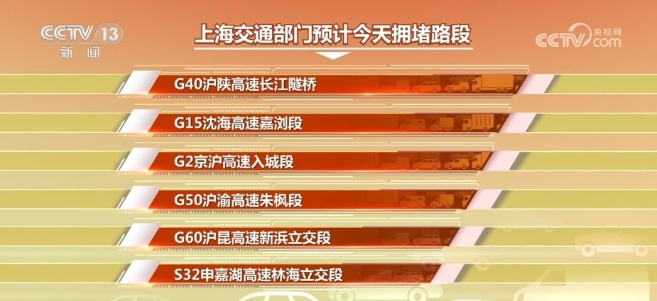 上海交通部門預計,返程高峰期間,G40滬陜高速長江隧橋、G15沈海高速嘉瀏段、G2京滬高速入城段、G50滬渝高速朱楓段、G60滬昆高速新浜立交段、S32申嘉湖高速林海立交段等入城方向?qū)a(chǎn)生一定擁堵。