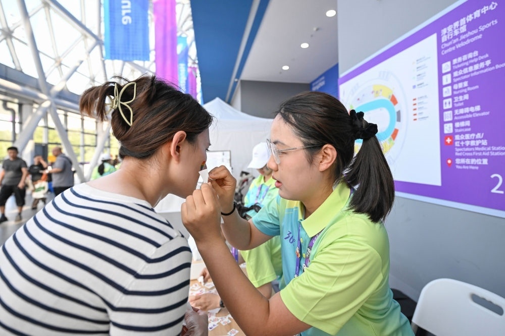 9月26日,浙江杭州淳安界首體育中心自行車(chē)館場(chǎng)館志愿者為前來(lái)觀賽的觀眾貼上加油助威貼紙。新華社記者 胡虎虎 攝
